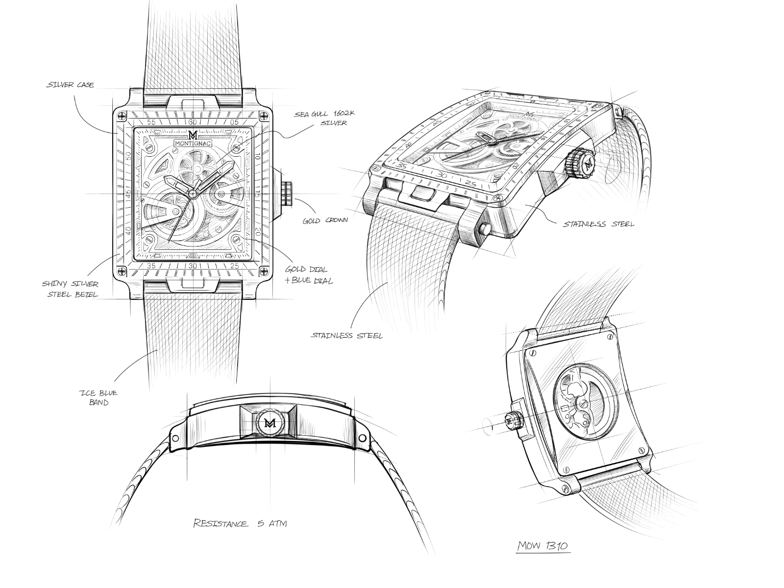 Designed and assembled in France, the MOW1310 men's watch stands out with its imposing 55 × 42 mm silver case. Paired with an ice-blue dial featuring matte gold details, it reveals the gears of its automatic movement, for a contemporary and refined look. With its exclusive design, this model embodies elegance, sophistication, and durability.