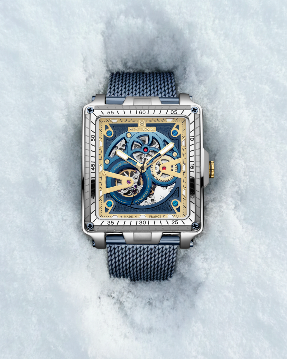 Designed and assembled in France, the MOW1311 men's watch stands out with its imposing 55 × 42 mm silver case. Combined with a deep blue dial featuring matte gold details, it reveals the gears of its automatic movement, for a modern and elegant look. This model, with an exclusive design, is distinguished by its elegance and sophistication.
