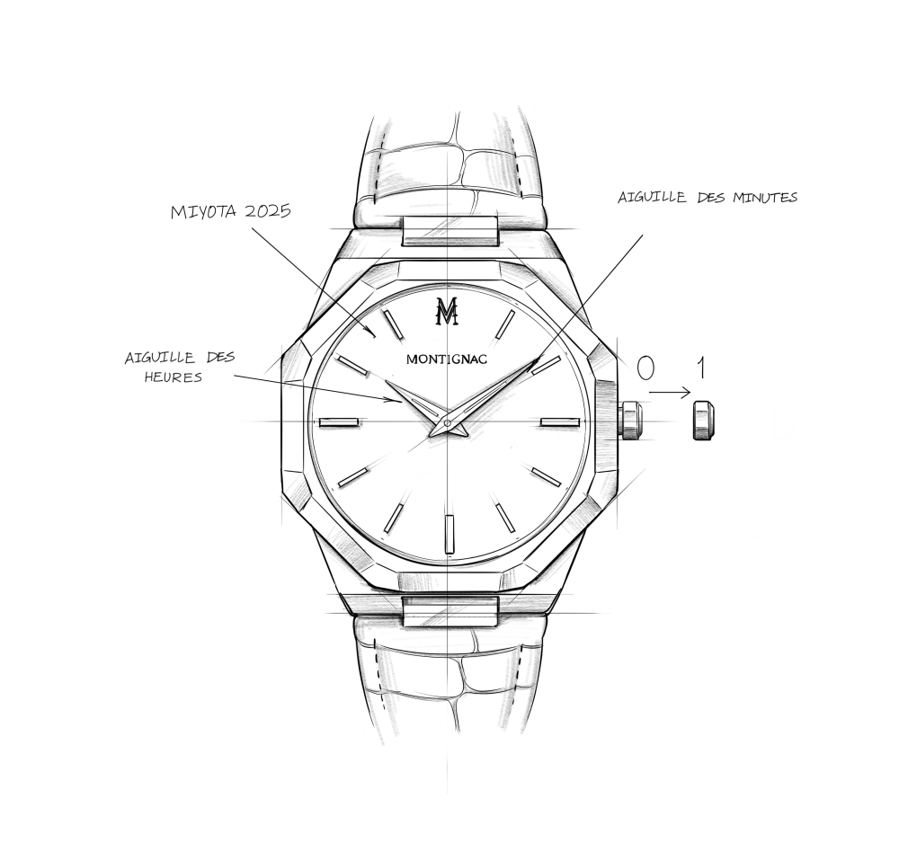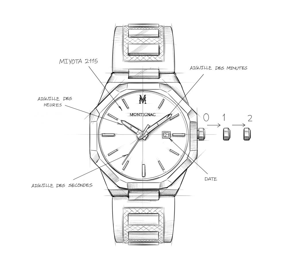 Une montre automatique a une réserve de marche, c'est-à-dire la quantité d'énergie qui permet à la montre de fonctionner sans être remontée. Les montres automatiques Montignac ont une réserve de marche de 36 à 40 heures selon les modèles, cette information est indiquée dans chaque fiche de mouvement automatique. Comme c'est le mouvement de votre poignet qui remonte le mouvement et maintient la puissance maximale, la réserve de marche commencera à diminuer s'il n'y a pas suffisamment de mouvement, ce qui peut entraîner l'arrêt de la montre. Si votre montre s'arrête, nous recommandons de la remonter manuellement en suivant la procédure ci- dessous : (1) Laisser la couronne dévissée ou en position normale. (2) Tourner la couronne dans le sens des aiguilles d'une montre au moins 55 fois pour la charger complètement. Vous sentirez une légère résistance en remontant la montre.