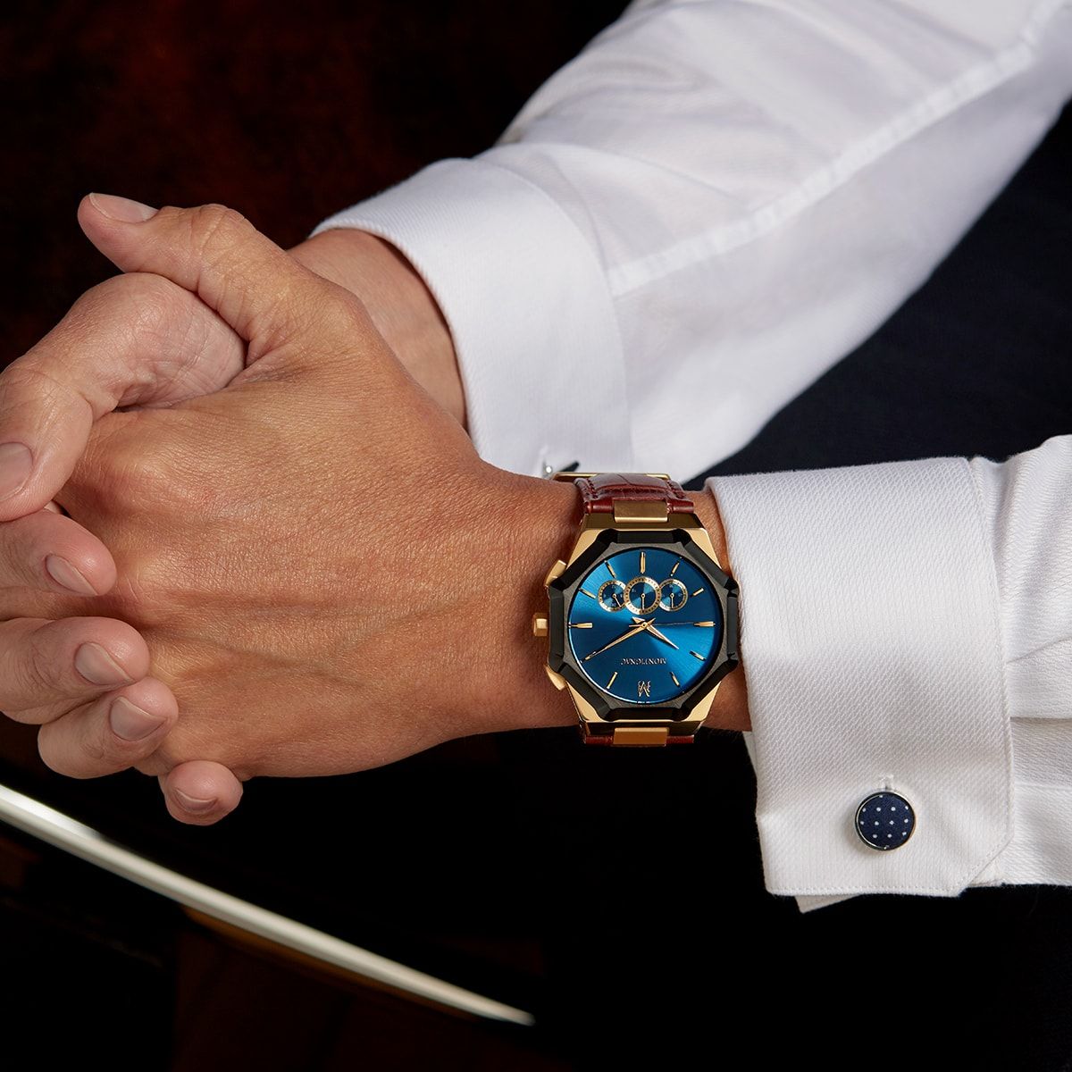 Faussement classique, véritablement contemporaine, cette montre pour hommes à quartz fait la synthèse de l’esprit du luxe traditionnel avec une boîte or, combinée à une lunette octogonale puissante noire qui vient coiffer un cadran soleillé bleu aussi moderne que dynamique.