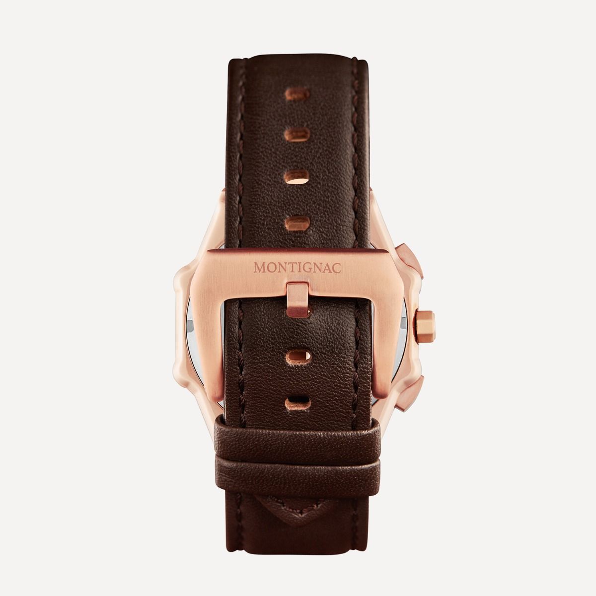 Puissante et singulière, cette montre pour hommes, à quartz, offre un contraste exclusif entre un cadran noir et un boîtier de couleur or, affirmé par une lunette octogonale chère à la maison Montignac.