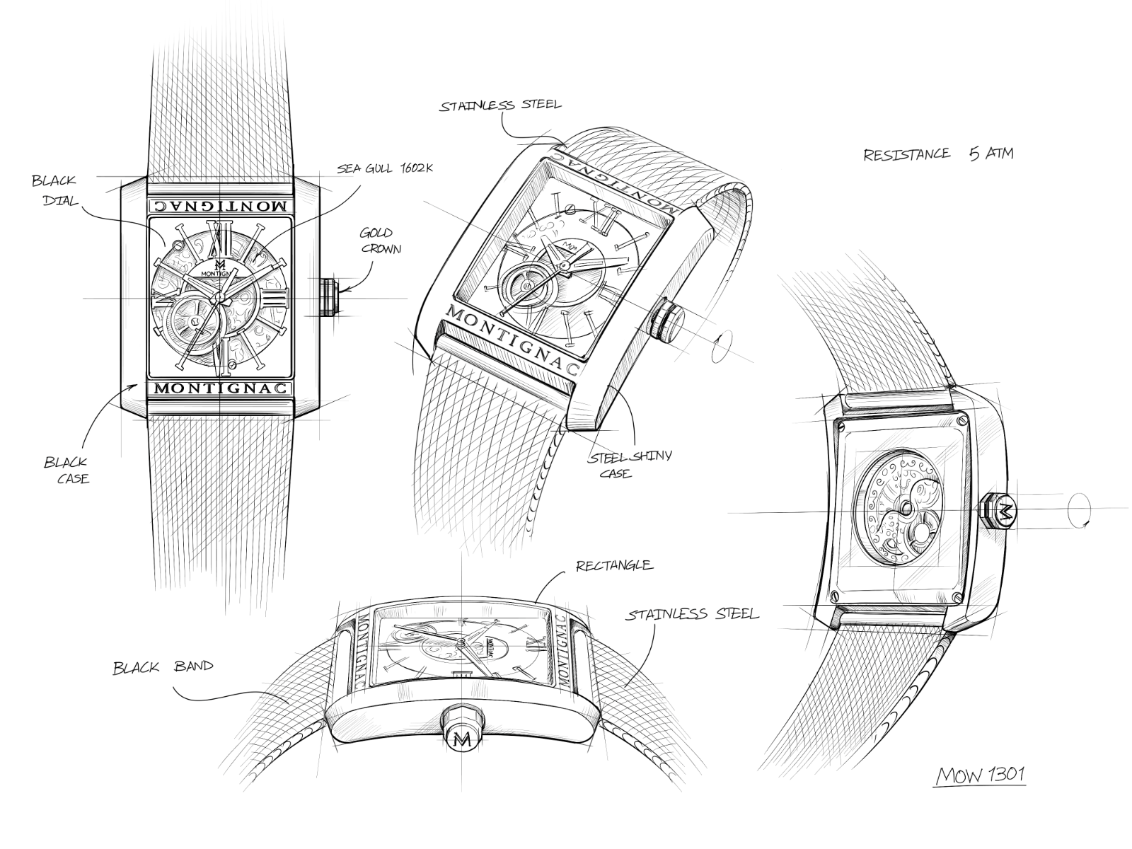 Singulière par sa forme rectangulaire, la montre pour homme MOW1301 incarne pleinement l'ADN Montignac en revisitant un modèle iconique de la Maison. Dessinée et assemblée en France, elle révèle les rouages dorés de son mouvement automatique grâce à un cadran ajouré.