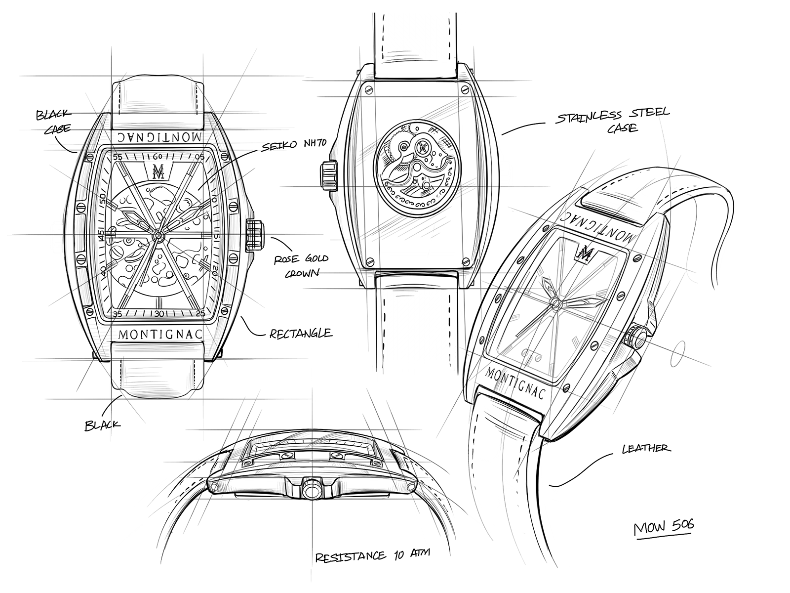 Entre puissance et raffinement, la montre pour homme MOW506 est une création caractéristique de la Maison. Dessinée et assemblée en France, elle combine un boîtier de forme tonneau particulièrement audacieux avec un cadran ajouré en forme d'étoile. Ce modèle laisse entrevoir les rouages de son mouvement automatique japonais.