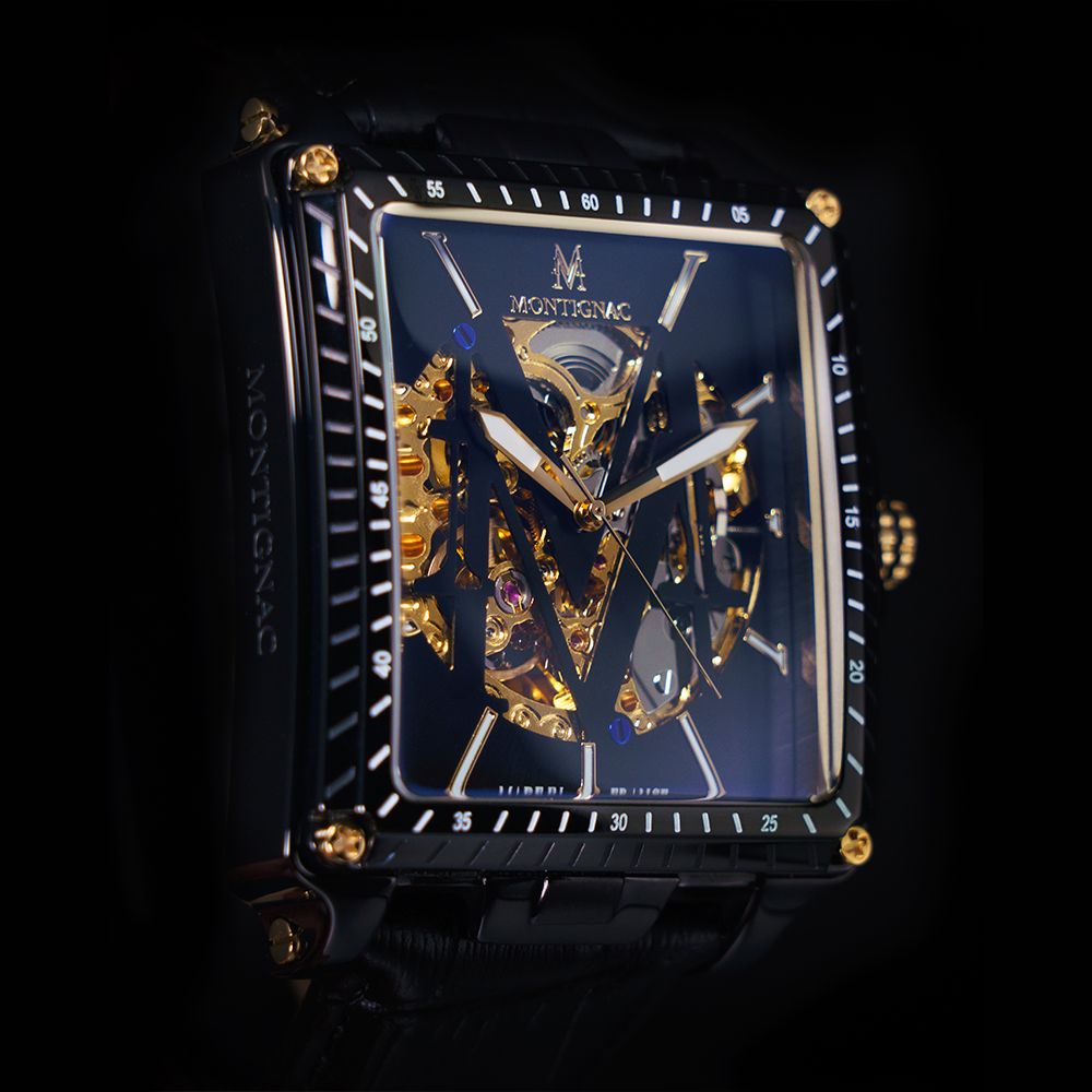 Dessinée et assemblée en France, la montre pour homme MOW708 est un modèle iconique de la Maison. Son cadran noir présente le monogramme Montignac "double M" par-dessus les rouages du mouvement automatique. L'alliance de tons doré et noir souligne le puissant profil carré de cette création qui sort des sentiers battus.