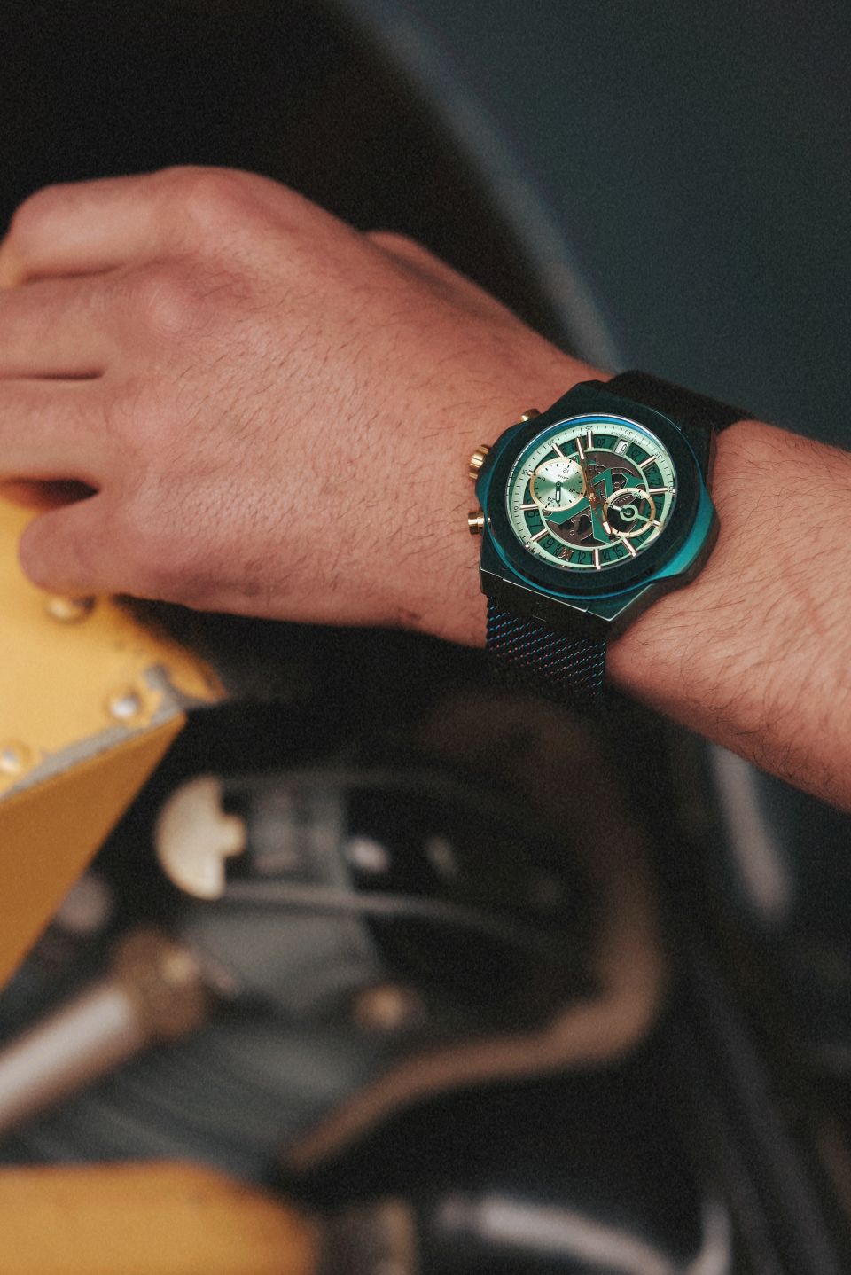 Progettato e assemblato in Francia, l'orologio da uomo MOW1309 si distingue per la sua cassa da 42 mm in acciaio color verde viridity, che si abbina perfettamente al quadrante con dettagli dorati. Animato da un movimento giapponese TMI VK64, offre un display completo che include un cronografo centrale, un indicatore delle 24 ore e un datario. Presenta un bracciale a maglia milanese abbinato alle stesse tonalità di verde, dotato di una fibbia a clip che garantisce comfort e sicurezza al polso.